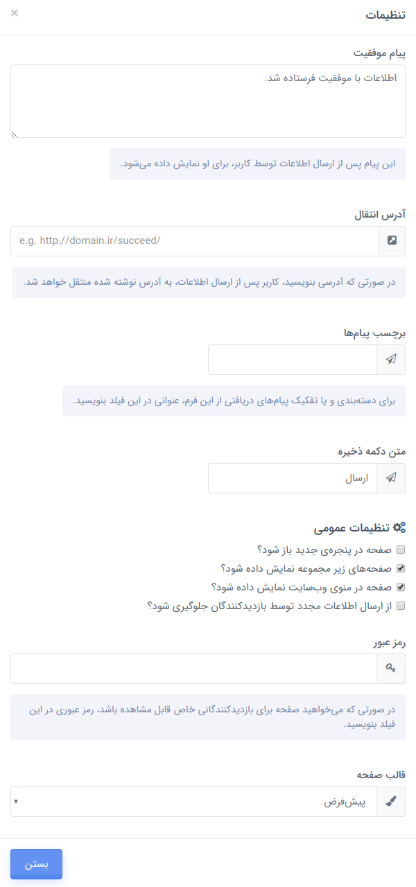 • بخش تنظیمات اختصاصی صفحه «فرم دریافت اطلاعات»، دارای امکان شخصی‌سازی؛ پیام موفقیت، آدرس انتقال، برچسب‌ (دسته‌بندی) پیام‌ها و متن دکمه ذخیره است.
