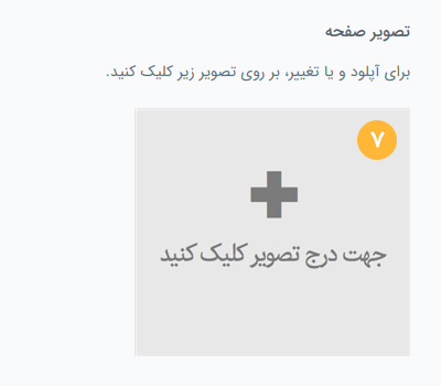 ۷- روی مربع خاکستری «درج تصویر» کلیک و از سیستم خود، تصویر شاخصی برای صفحه بارگذاری کنید. (نمایش این تصویر بستگی به تنظیمات قالب وبسایت دارد).