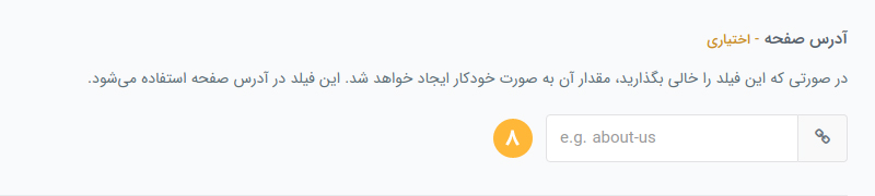۸- کلمههای فارسی یا انگلیسی مرتبطی با موضوع صفحه در جایگاه «آدرس صفحه» بنویسید (نوشتن کلمهها به انگلیسی باعث کسب امتیاز بیشتر صفحه در موتورهای جستجو میشود. این کلمه هنگام نمایش صفحه، در ادامه آدرس وبسایت نمایش داده میشود).