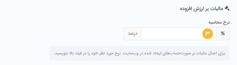 ۳- برای اعمال مالیات بر صورتحسابهای ایجاد شده در وبسایت، نرخ مورد نظر خود را در فیلد مشخص شده بنویسید.
