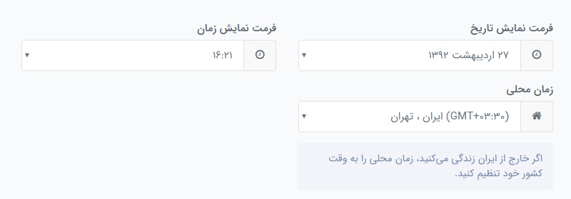 ۶- زمان وبسایت به صورت خودکار تنظیم میشود، در صورتی که تمایل دارید نحوه نمایش زمان در وبسایت خود را تغییر دهید، میتوانید از فیلدهای مرتبط با فرمت نمایش زمان استفاده کنید.
