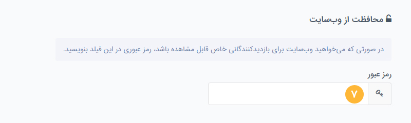 ۷- اگر میخواهید برای وبسایت خود رمز عبور تعریف کنید، در قسمت «محافظت از وبسایت» رمز عبور مورد نظر خود را تعریف کنید.