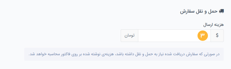 ۳- در صورتی که سفارش دریافت شده نیاز به حمل و نقل دارد، میتوانید در فیلد اول هزینه ارسال را بنویسید تا روی فاکتور مشتری محاسبه شود.