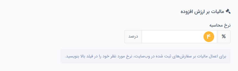 ۴- برای اعمال مالیات بر سفارشهای ثبت شده در وبسایت، نرخ مورد نظر خود را در فیلد دوم بنویسید.