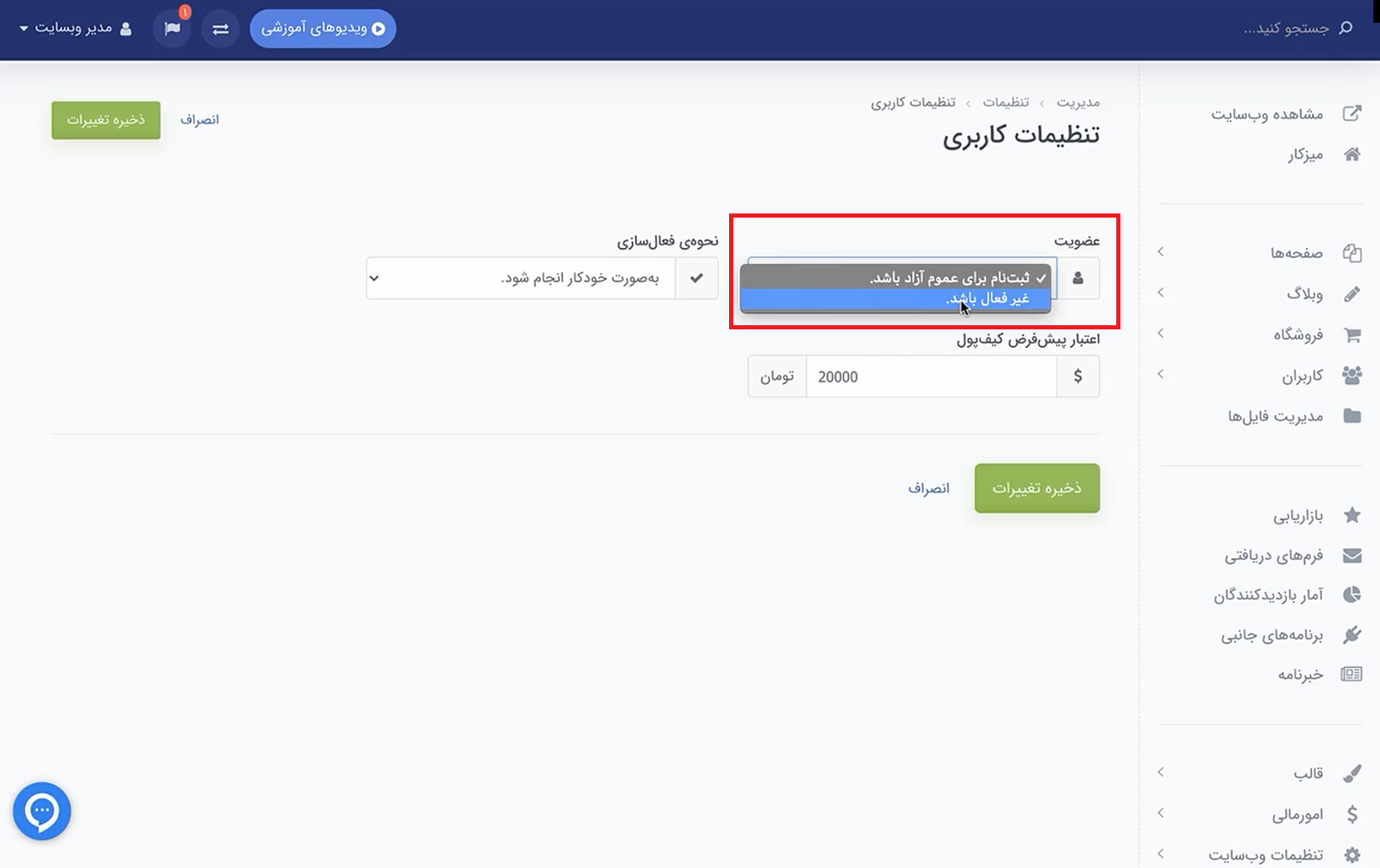 بعد از این کار وارد صفحه جدیدی میشوید که در آن میتوانید تنظیمات ثبت نام در سایتتان را تغییر دهید. همانطور که در عکس زیر میبینید، در بخش عضویت همین صفحه 2 گزینه وجود دارد.