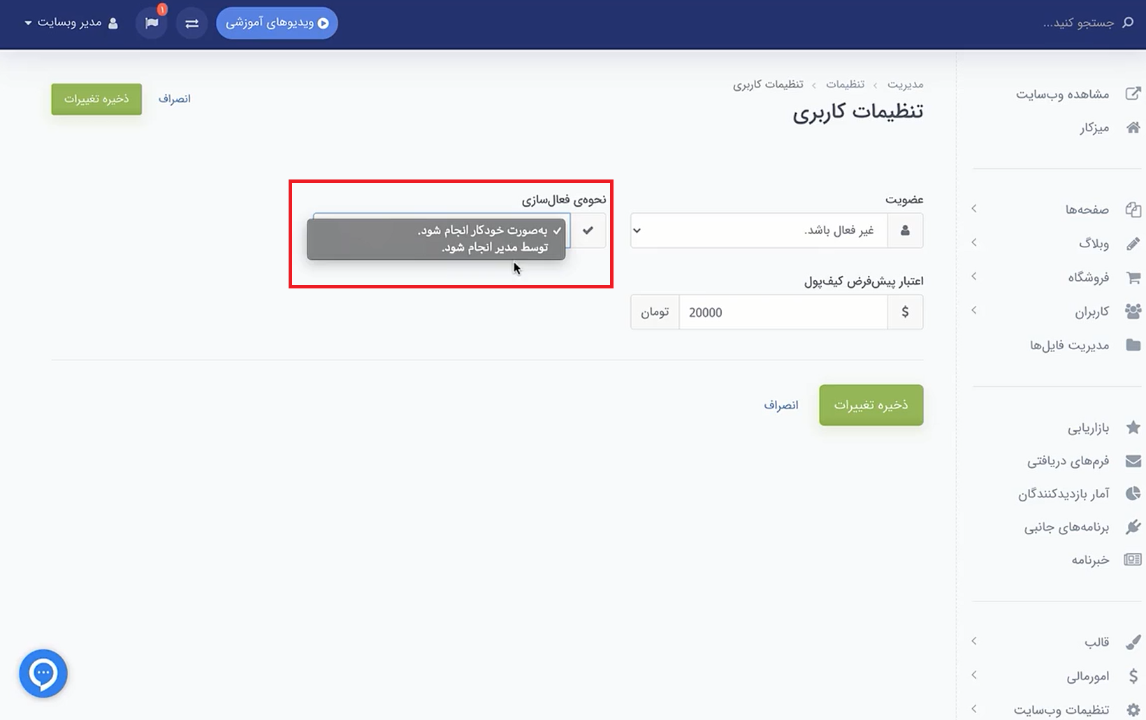 در کنار بخش عضویت، یک قسمت دیگر به نام «نحوه فعالسازی» وجود دارد. در این قسمت میتوانید تعیین کنید کاربرانی که در سایتتان ثبت نام کردهاند، چطور تایید شوند.