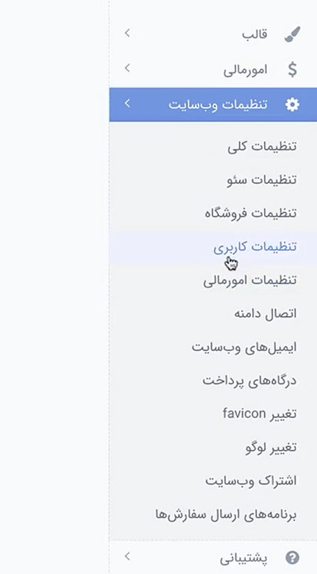 ابتدا وارد پنل مدیریت فروشگاه اینترنتیتان شوید و از منوی سمت راست روی گزینه «تنظیمات وبسایت» کلیک کنید. با کلیک روی این گزینه چند گزینه دیگر باز میشود، در این منوی جدید روی گزینه «تنظیمات کاربری» کلیک کنید.